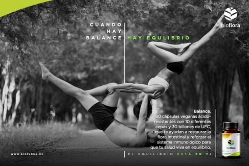 Partiendo de esta realidad, nace la nueva campaña para Balance de Bioflora cuyo concepto es Balance=Equilibrio. Balance es un Pro+Prebiótico que gracias a su contenido con 10 diferentes cepas y más de 30 billones de UFC ayuda a restaurar la flora intestinal y a reforzar el sistema inmunológico, promoviendo así la salud digestiva para restaurar el balance .
