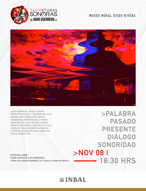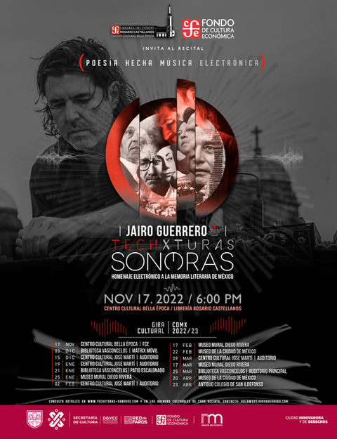 Techxturas Sonoras es un proyecto transmedia creado por el artista sonoro Jairo Guerrero. Es el único proyecto en México que rinde homenaje a la literatura clásica mexicana a través de música electrónica experimental, activando un puente entre la palabra escrita y el arte sonoro contemporáneo.